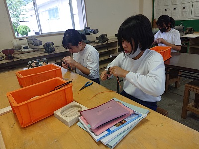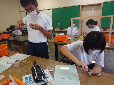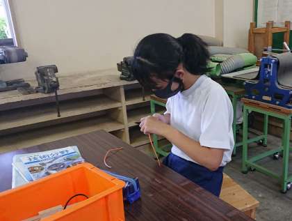 2年生は技術でドーム調光スタンド作成を行っています。今日は、ニッパヲ使ってビニールコードの皮むきを行ってから、はんだを使って金属の接合を行いました。
