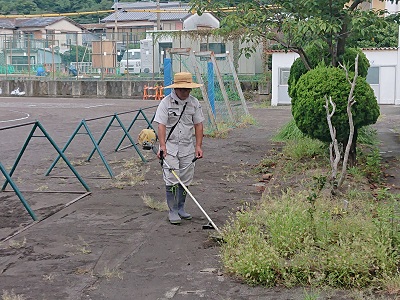 用務員さんが小中合同運動会に向けて、グラウンド及びその周辺の草刈りを行っています。