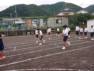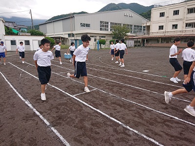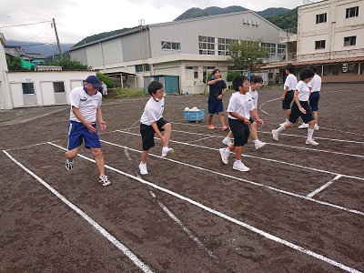1年生は体育で「短距離走」について学習しています。スタートダッシュ動作や加速動作について確認しました。