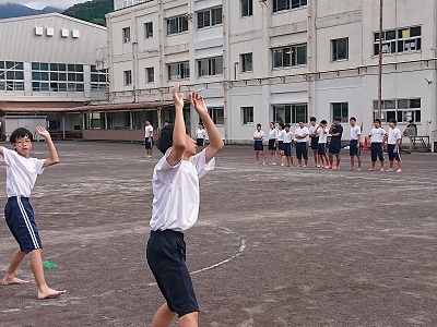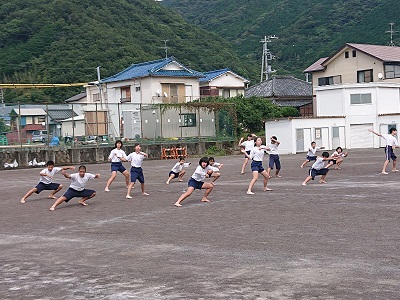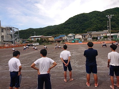 第5・6時に、3学年合同で体育を行っています。「戸田中ソーラン」の演技では、3年生が1・2年生の踊りの出来映えを確認しています。