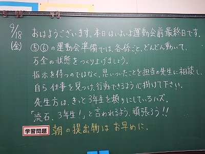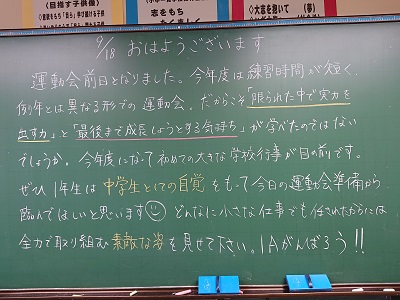 各クラスには、学級担任が思いを込めて用意した「黒板メッセージや今日の名言」が掲げられています。朝早くから学級担任が準備しています。