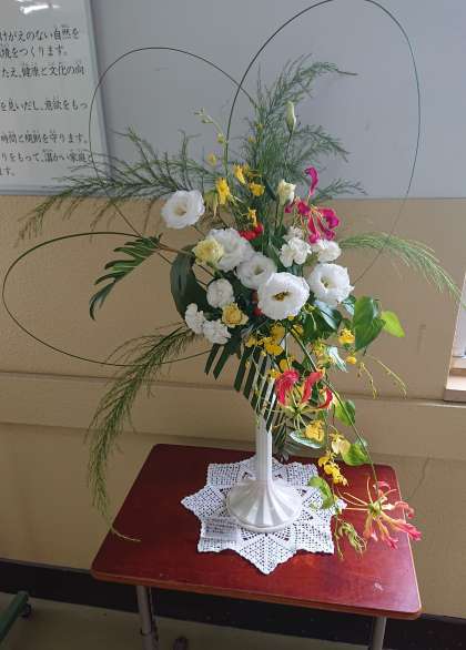 小池先生が1階職員室前に、ヨーロピアンフラワーアレンジメント「グロリアス」を飾ってくれました。いつもありがとうございます。