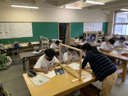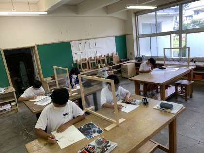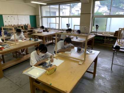 1年生は美術で、静岡県信用漁業協同組合連合会主催の「海の子作品展」に出品する作品制作を行っていました。