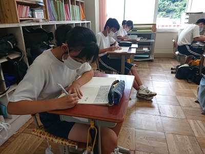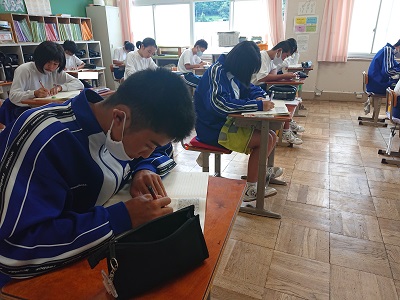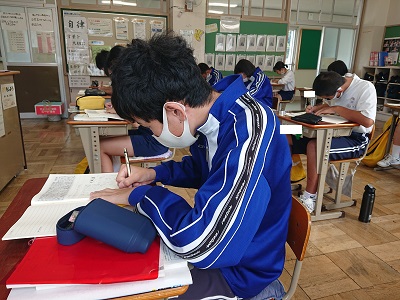 2年生の潮風タイムの様子です。全学年で「天声人語の視写」を行っています。一字一字に心を込めて、丁寧に書いています。