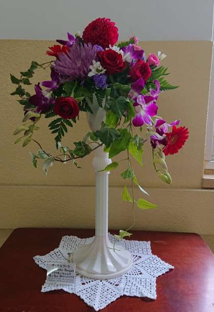 小池先生が1階職員室前に、ヨーロピアンフラワーアレンジメント「オータムブーケ」を飾ってくれました。いつもありがとうございます。
