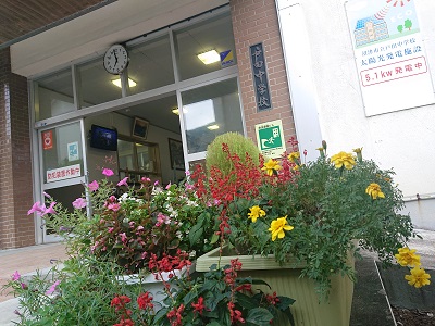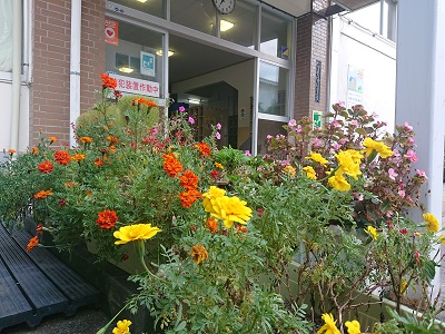 玄関の様子です。玄関前には「戸田花の会」の皆様からいただいたホウキ草やマリーゴールド等がきれいに咲いています。