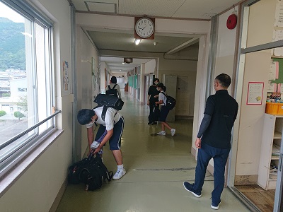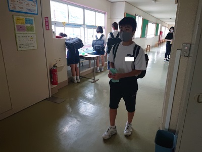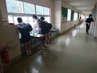 登校した児童生徒は、必ずうがい、手洗いを行ってから教室に入ります。登校後のルーティーンです。教員も生徒の様子を見守っています。