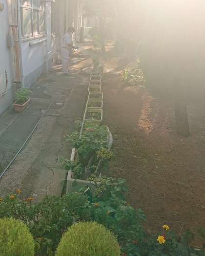 玄関の様子です。玄関前には「戸田花の会」の皆様からいただいたホウキ草やマリーゴールド等がきれいに咲いています。用務員さんが水やりを行っていました。
