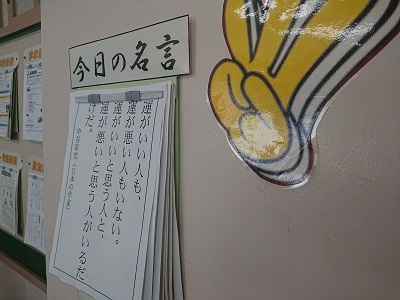 各クラスには、学級担任が思いを込めて用意した「黒板メッセージや今日の名言」が掲げられています。朝早くから学級担任が準備しています。