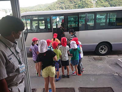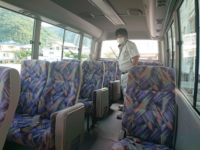 小学3・4年生が、石鹸づくりに出発しました。マイクロバスに乗車してお出かけです。出発前の車内点検もバッチリです。