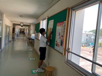広報委員会の生徒が、校内掲示のポスター貼り替え作業をしていました。