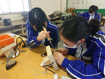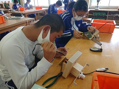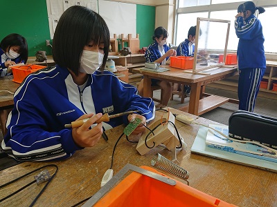 2年生は技術でドーム調光スタンド作成を行っています。今日は、はんだを使って金属の接合を行いました。