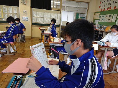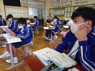 1年生は英語で中間テスト対策の学習を行っていました。「英語のしくみ」のページを見ながら、確認をしていました。