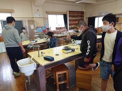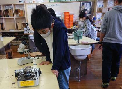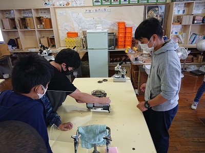 小学6年生の理科を中学校教員が指導しています。子どもたちは検証実験をしながら、楽しみながら学習をしています。