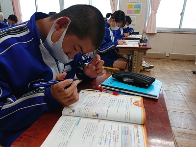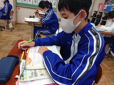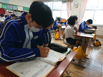 2年生は英語で中間テスト対策の学習を行っていました。「英語のしくみ」のページを見ながら、確認をしていました。