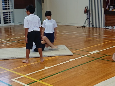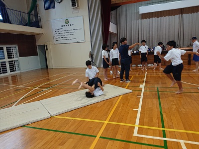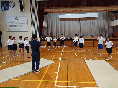1年生は体育で「マット運動」を行っています。最初に、前転・後転など基本の運動を確認しました。