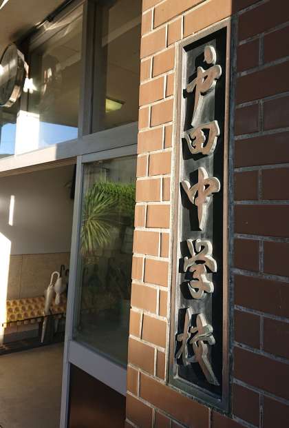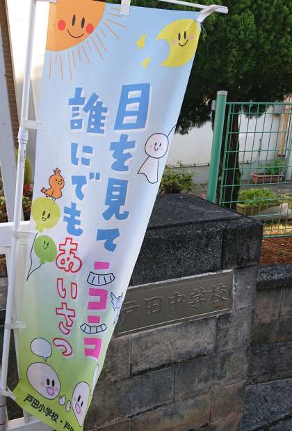 玄関先の様子です。威風堂々たる校名プレートが子どもたちの登校を見守ります。