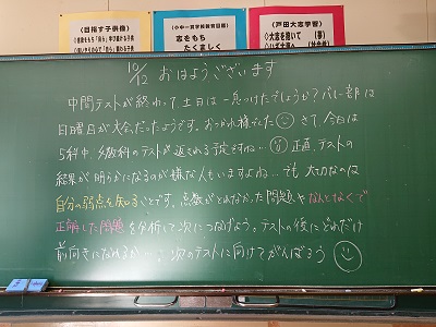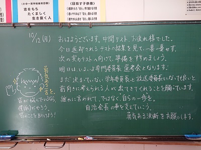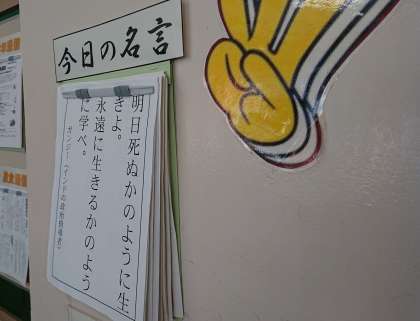 各クラスには、学級担任が思いを込めて用意した「黒板メッセージや今日の名言」が掲げられています。朝早くから学級担任が準備しています。