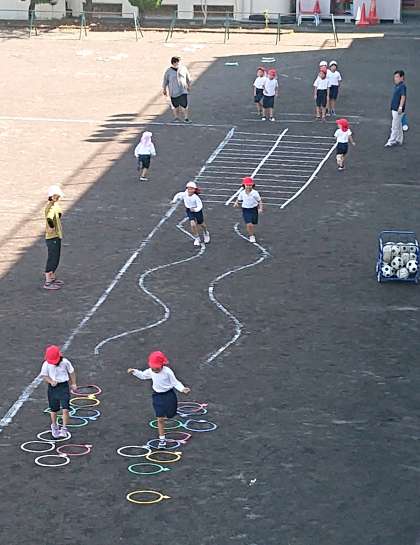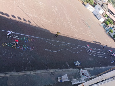 小学1・2年生の体育の様子を3階から撮影しました。上から見るとラインカーでコースを作り、子どもたちが楽しんで活動できるように工夫しています。