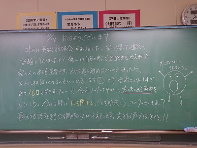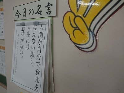各クラスには、学級担任が思いを込めて用意した「黒板メッセージや今日の名言」が掲げられています。朝早くから学級担任が準備しています。