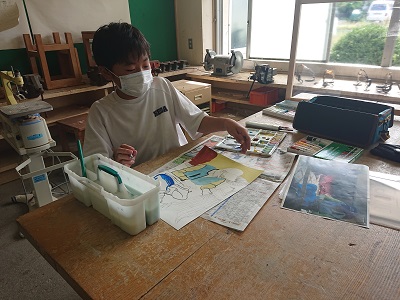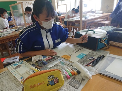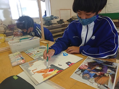 1年生は美術で、静岡県信用漁業協同組合連合会主催の「海の子作品展」に出品する作品制作を行っていました。