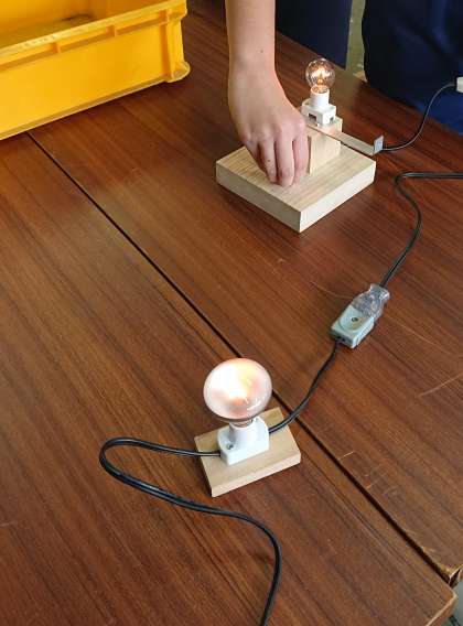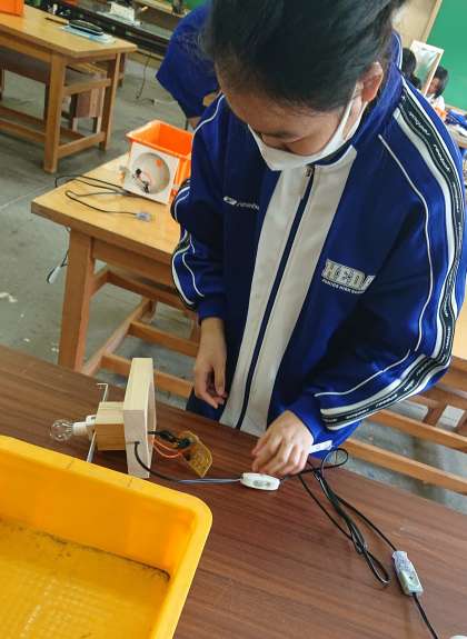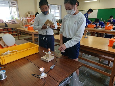 2年生は技術でドーム調光スタンド作成を行っています。今日は、はんだを使って金属の接合を行いました。作業が終わった生徒から電気チェッカーを使って、電気がつくかどうかを調べました。