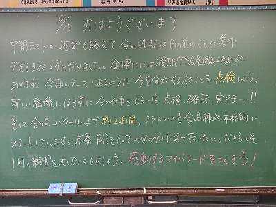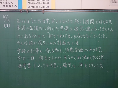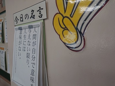 各クラスには、学級担任が思いを込めて用意した「黒板メッセージや今日の名言」が掲げられています。朝早くから学級担任が準備しています。