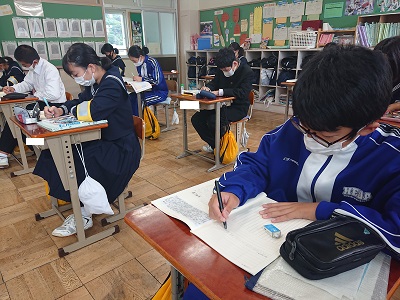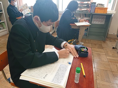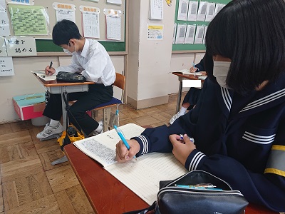 2年生の潮風タイムの様子です。全学年で「天声人語の視写」を行っています。「天声人語」をじっくり読み、丁寧に書いています。