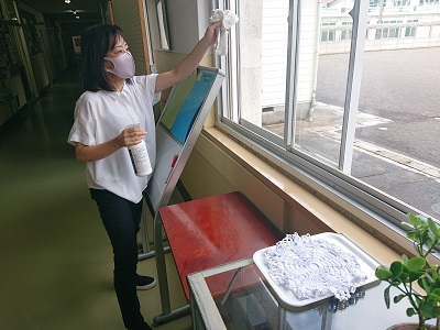 用務員さんとスクールサポートスタッフさんが、校内環境整備に努めています。体育館のペンキ塗りも連日行っています。体育館内がきれいになっています。