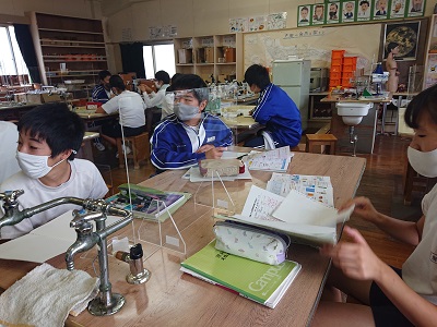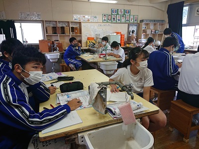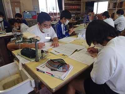 3年生は理科で「酸・アルカリとイオン」について学習しています。酸性やアルカリ性の水溶液の性質について実験結果をまとめていました。
