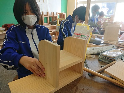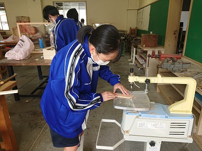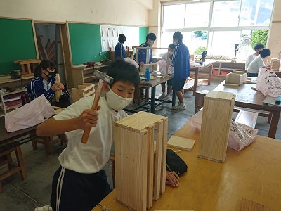 1年生は技術で「材料と加工に関する技術」という単元を学習しています。今日はベルトサンダーを使ってやすりがけをしたり、げんのうを使って接合を行ったりしました。