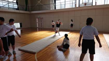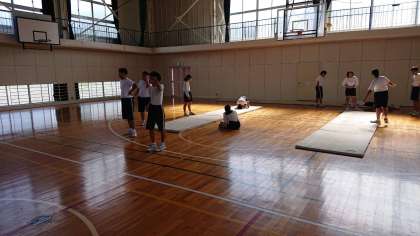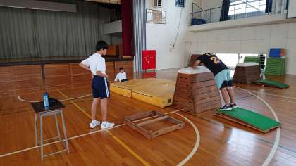3年生は体育で「跳び箱運動」を行っています。クラスメイトのアドバイスや教員の助言を聞きながら、技の完成度を高めています。