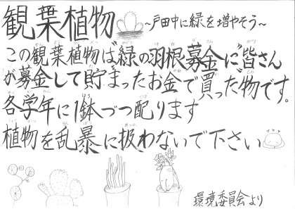 環境委員の生徒が各クラスに観葉植物を置きました。大切に育ててください。