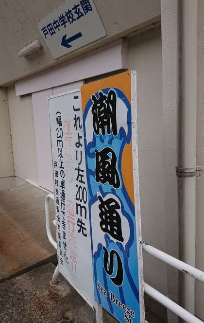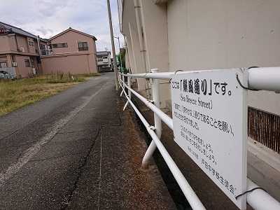 校舎南側は、先輩方が命名した「潮風通り」です。この通りでは、特に気持ちのよいあいさつを心がけましょう。