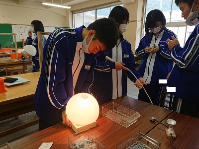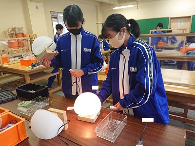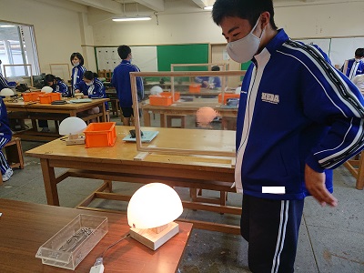 2年生は技術でドーム調光スタンド作成を行っています。今日は全員仕上げの活動を行いました。みんな上手に部品接合などを行い、作品完成へと向かいました。