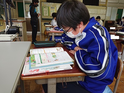 1年生は英語でPROGRAM8の学習を行っています。「can 〜できる」を使った文章作りをしていました。