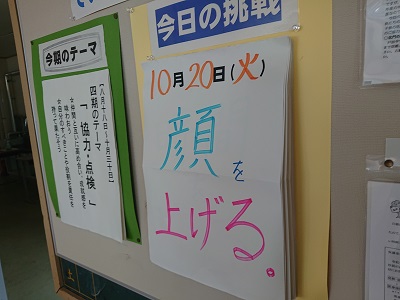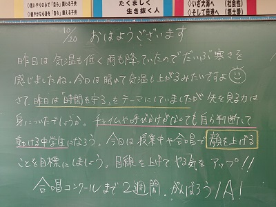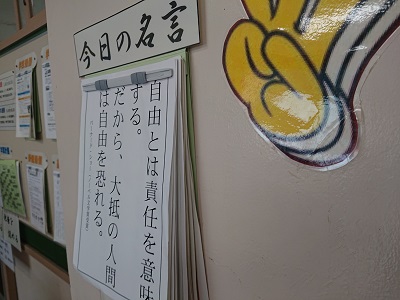 各クラスには、学級担任が思いを込めて用意した「黒板メッセージや今日の名言」が掲げられています。朝早くから学級担任が準備しています。