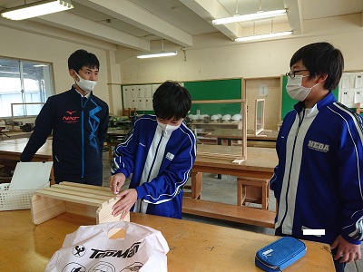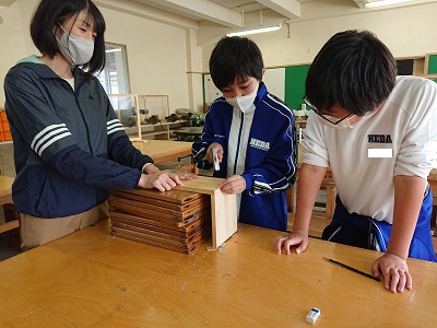 1年生は技術で「材料と加工に関する技術」という単元を学習しています。今日はきりで穴を開けたり、げんのうを使って接合を行ったりしました。