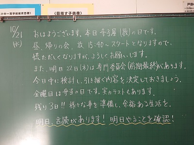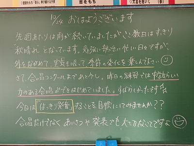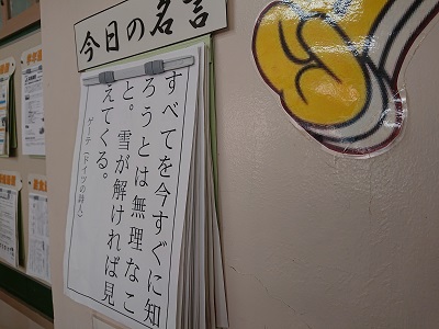各クラスには、学級担任が思いを込めて用意した「黒板メッセージや今日の名言」が掲げられています。朝早くから学級担任が準備しています。