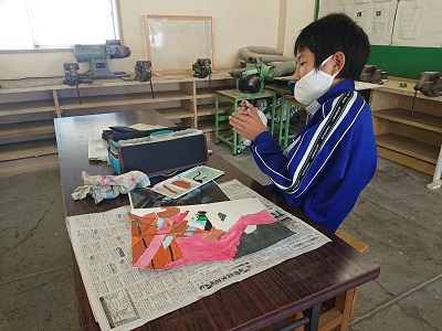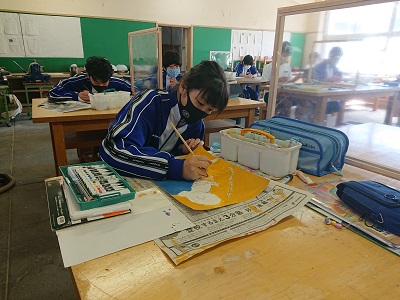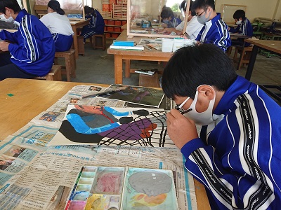 1年生は美術で、静岡県信用漁業協同組合連合会主催の「海の子作品展」に出品する作品制作を行っていました。