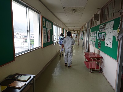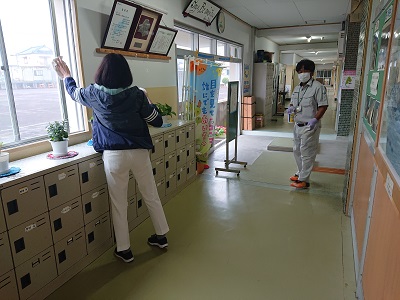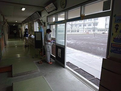 用務員さんと養護教諭が、朝早くから校内環境整備に努めています。