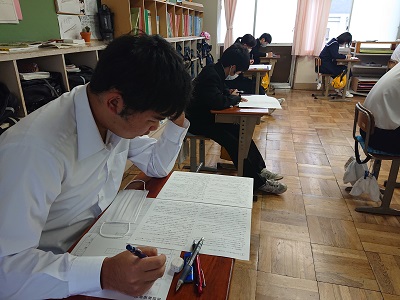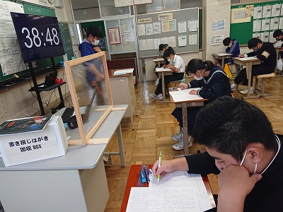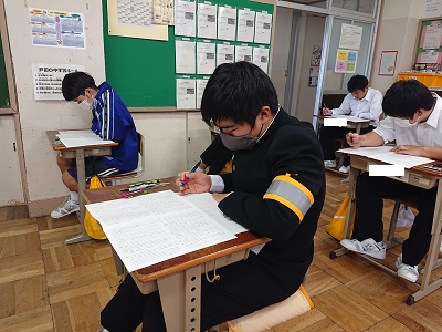 本日、3年生は「実力テスト(5教科)」を実施しています。高校入試まであと半年、今日は自分の力を試しています。