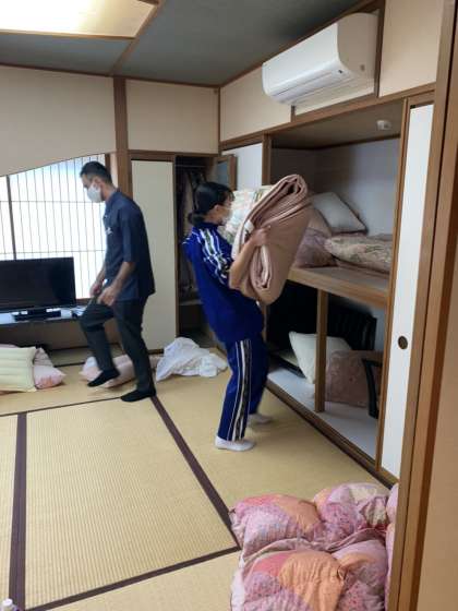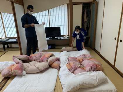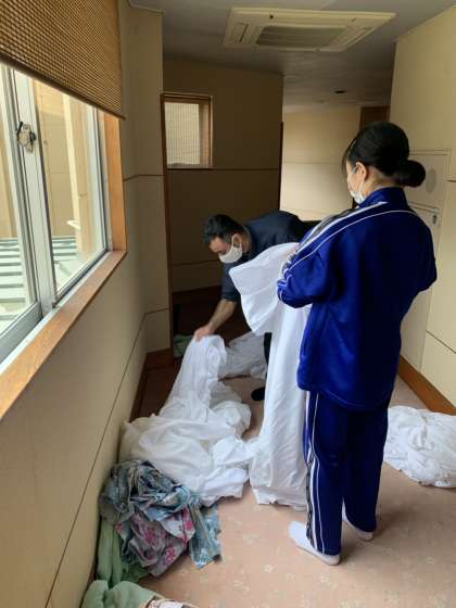 味わいの宿 ときわや様での活動の様子です。食器洗いを最初に行った後、お客様が宿泊した部屋の布団をたたんだり、清掃を行ったりしています。