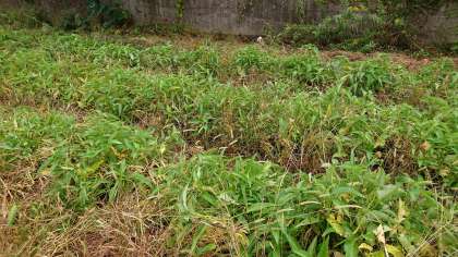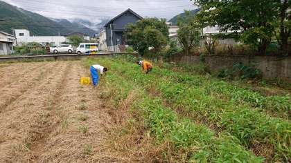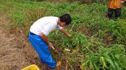 実季楽農園様での活動の様子です。今、収穫しているのは、空芯菜(くうしんさい)という野菜です。