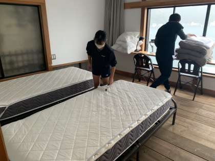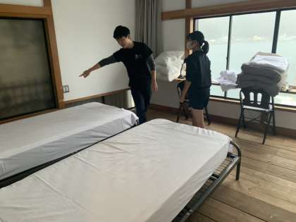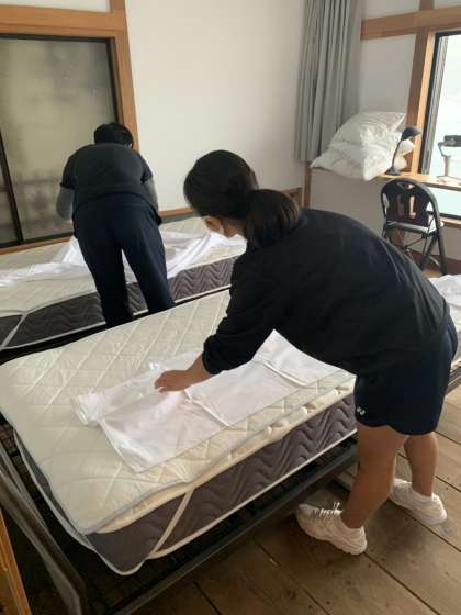 タゴールハーバーホテル様での活動の様子です。客室のベッドを丁寧に整えていました。