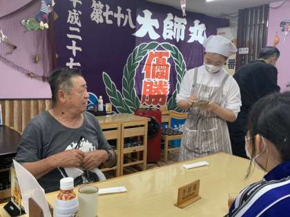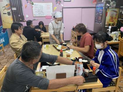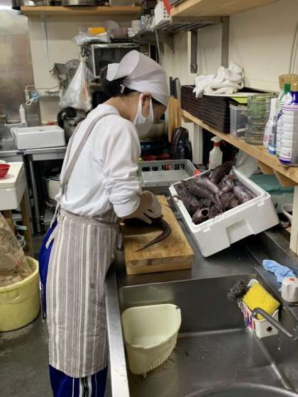 魚重食堂様での活動の様子です。深海魚のトウジンの鱗取りやお客様から注文聞き、料理提供をしていました。