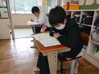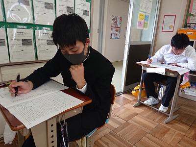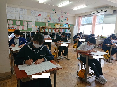 本日、3年生は「実力テスト(5教科)」を実施しています。5時間目最後の教科は理科です。高校入試まであと半年、今日は自分の力を試しています。