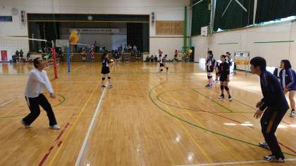 本日、バレーボール部は大平中に遠征し、練習試合を行っています。顧問やコーチが生徒のよさを引き出そうと支援しています。