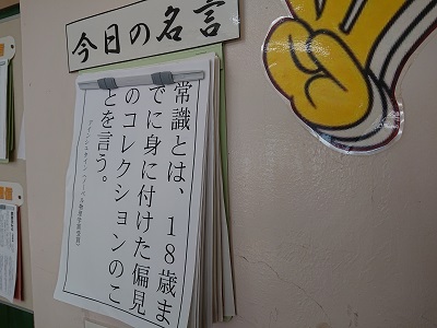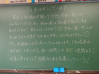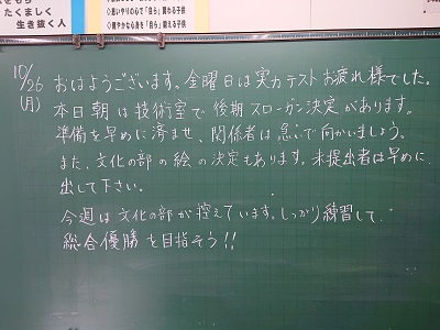 各クラスには、学級担任が思いを込めて用意した「黒板メッセージや今日の名言」が掲げられています。朝早くから学級担任が準備しています。
