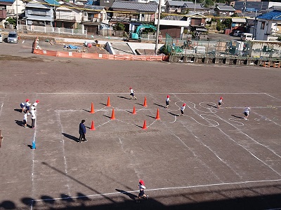 小1・2年生がグラウンドで体育を行っていました。ライン上を走ったり、ジャンプをしたりしていました。